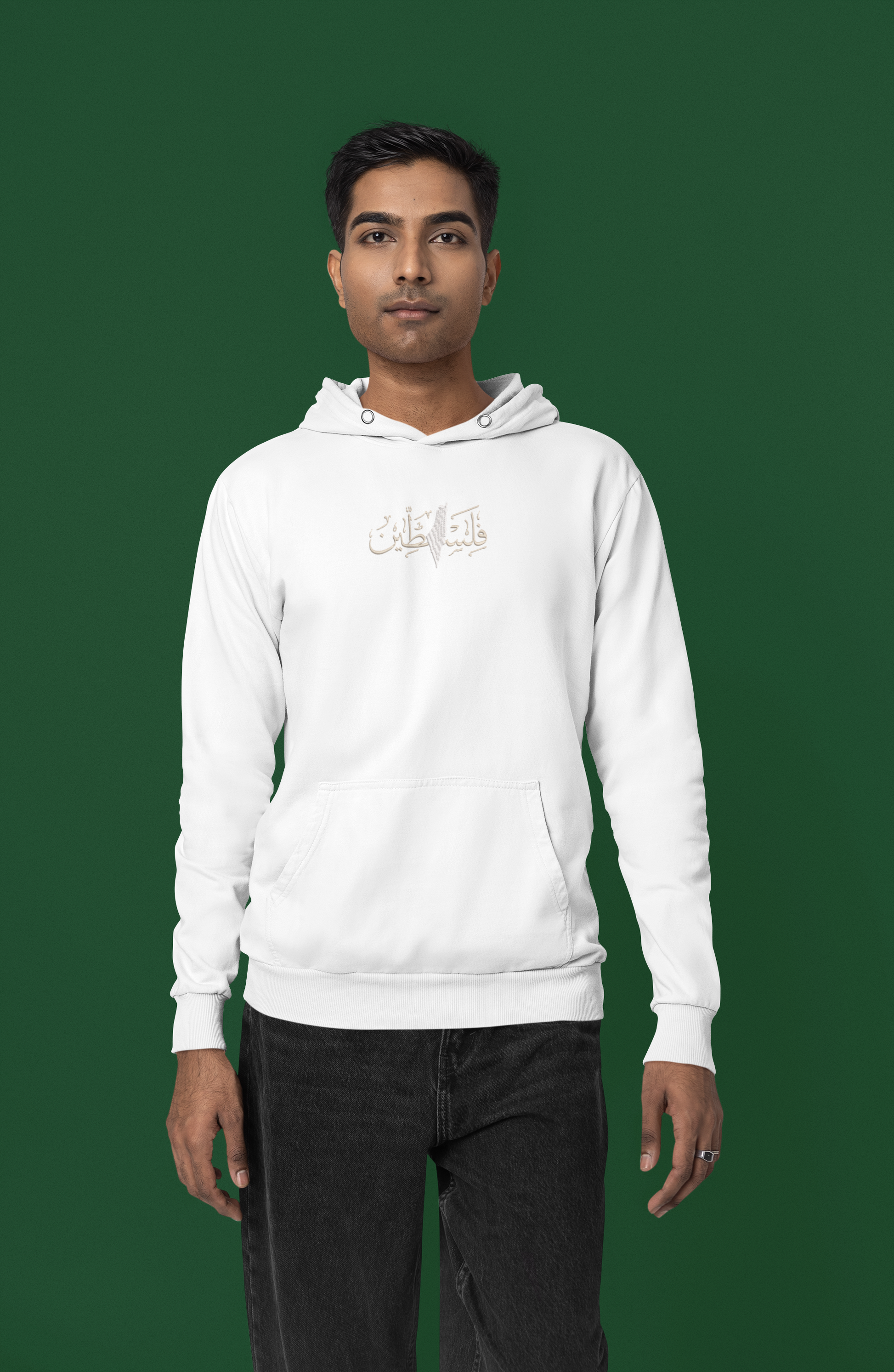 Pullover Hoodie with Embroidered Falasteen Arabic Palestine Hoodie.